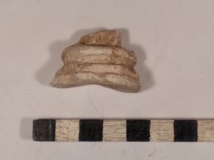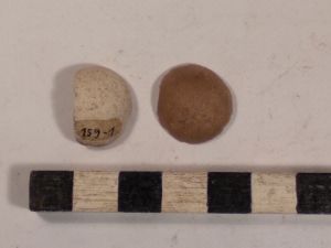 1 Murmel, 2 Fragm. ca. 4 cm große Figürchen, 1 Ziersockel (ca. 3 Cm), ein Nürnberger Pfennig (silber, 15..)