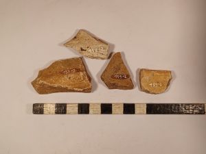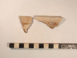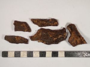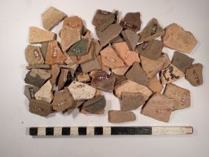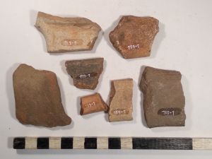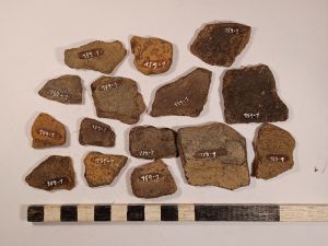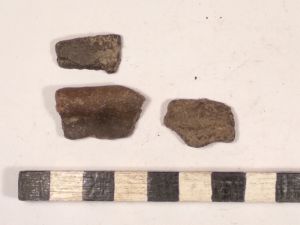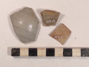 10 vorg. WS, der. 1 RS, viel SMA bis NZ Keramikmaterial, darunter WS, RS, 2 Schüsselkachelränder, Deckelfragm., Steinzeug, ein Schleifstein, 1 Klumpen Buntmetallschlacke, 2 halbe Schusser, Glasscherben.