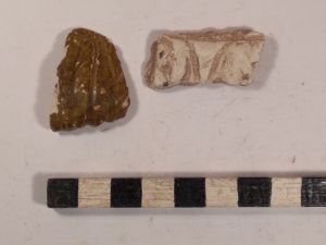 8 vorg. WS, 1 RS, 2 Silices, umfangr. SMA und NZ Keramikmaterial, darunter WS, RS, Deckelfragm.,Blattkachelscherben, 1 Düse (Schmiede?),